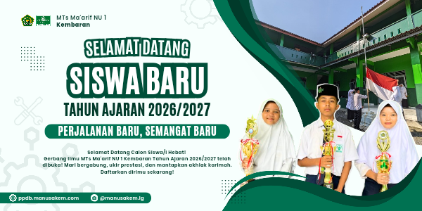 MTs Ma'arif NU 1 Kembaran adalah Madrasah Tsanawiyah dibawah naungan Lembaga Pendidikan Ma'arif NU Kabupaten Banyumas yang berkarakter kuat, berdiri kokoh di atas fondasi ajaran Ahlussunnah wal Jama’ah an-Nahdliyah. Kami tidak hanya mencetak siswa yang unggul secara akademik, tetapi juga membentuk pribadi yang berakhlak mulia, berpegang teguh pada toleransi, dan siap menjadi agen perubahan yang santun.